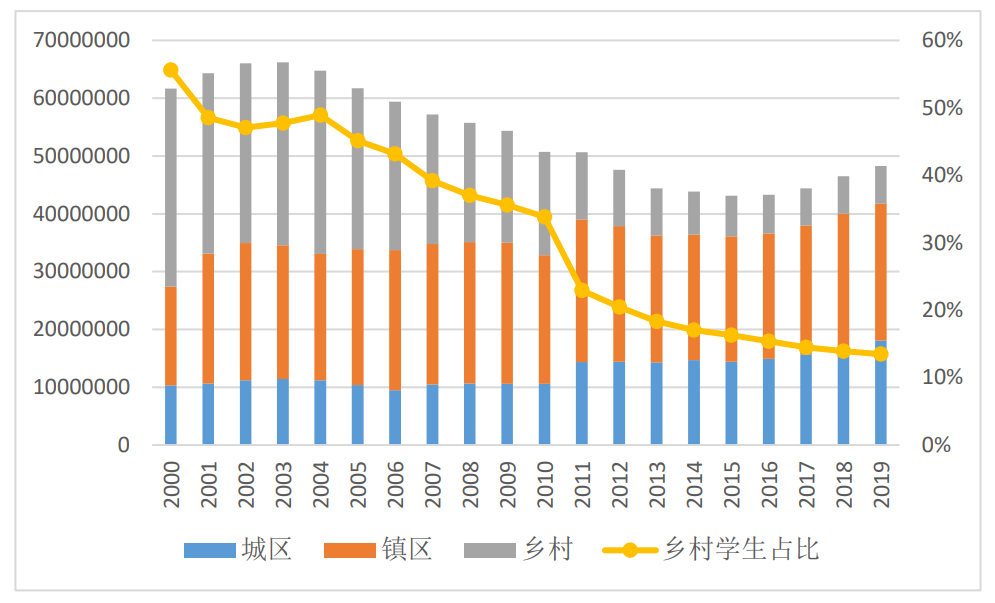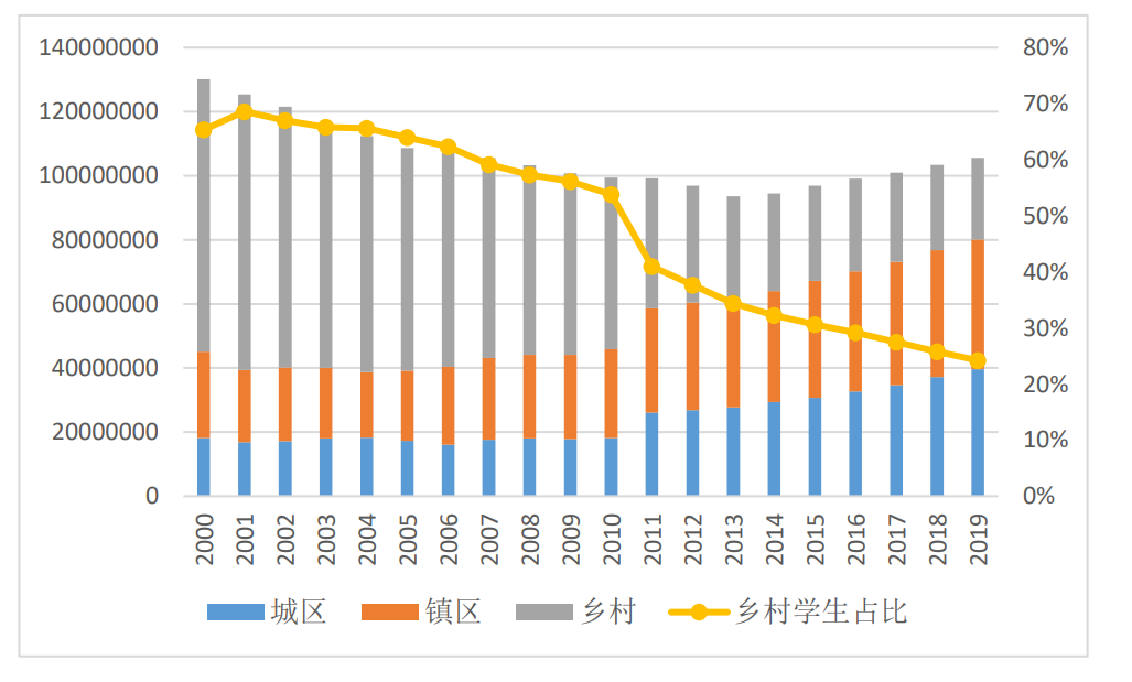 2000-2019年城乡小学在校生数及乡村学生占比(人,%) 北京大学中国教育财政科学研究所