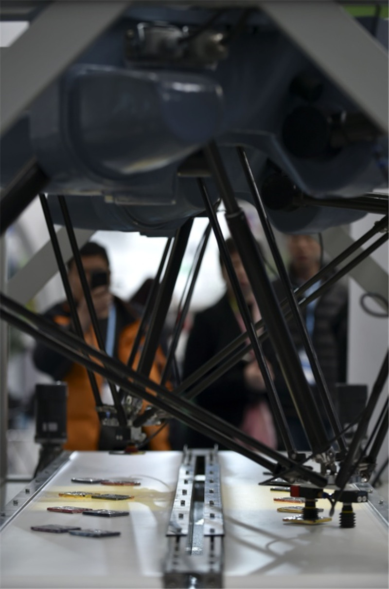 2024年3月9日,第13届中国(天津)国际装备制造业博览会上,观众参观用于分拣、装箱和整理的并联机器人。新华社