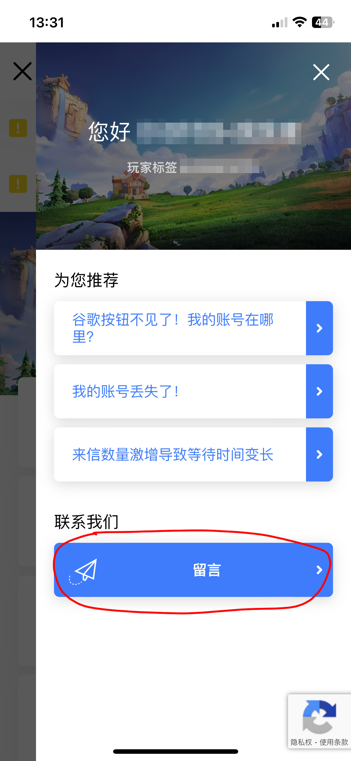 到这一步分歧就来了。有的人只能看到一个“留言”按钮(如下图),还有的人能看到一个额外的“联系客服”按钮。其中留言是先跟机器人聊天,确定你要申诉的账号之后才会转交人工处理,而联系客服按钮可以直接找到人工,不用跟机器人兜圈子。