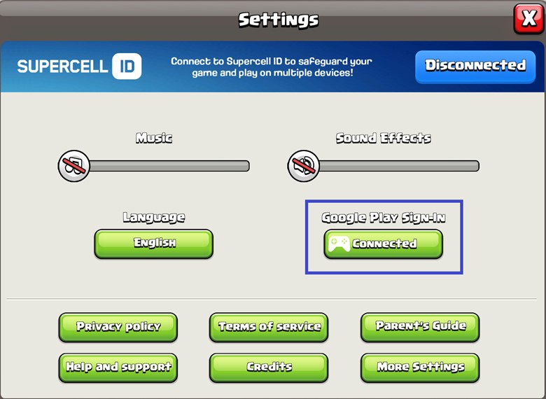 与 CR(皇室战争)和 BS(荒野乱斗)不同,COC 绑定 Supercell ID 后就没有 Google Play Sign-In 的绑定选项了。