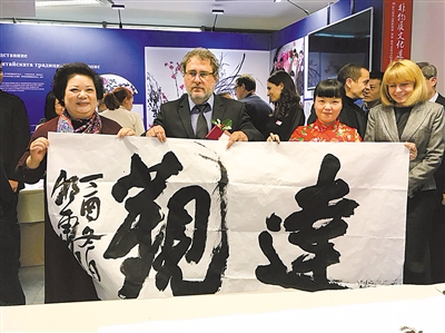 中国书法作品赠送给保加利亚文化部长巴诺夫(中)。