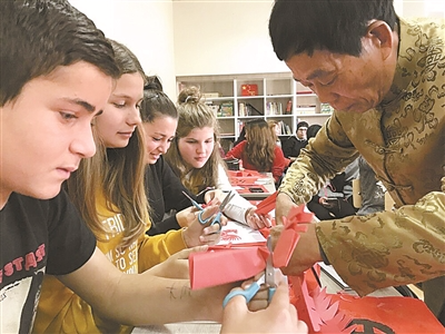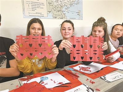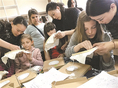 来自宁波旗袍协会的“绣娘”在索非亚138中学教学生刺绣。