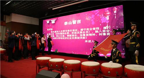 东营市泰安商会党支部书记、东营玉峰幼儿园园长张峰宣读有关文件。东营市工商联会员管理科科长、一级主任科员刘奇国、泰安市工商联经济联络处李耐昌为新加入成员单位授牌并颁发证书。