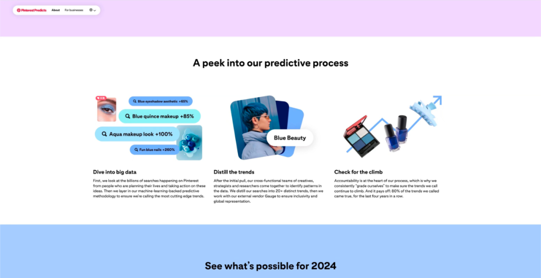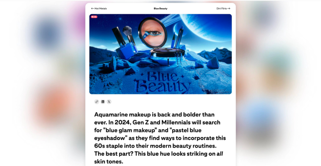 无独有偶,Pinterest公布的2024年设计关键词中,也有一个“Blue Beauty”,反映了蓝色在美妆领域的爆发力。
