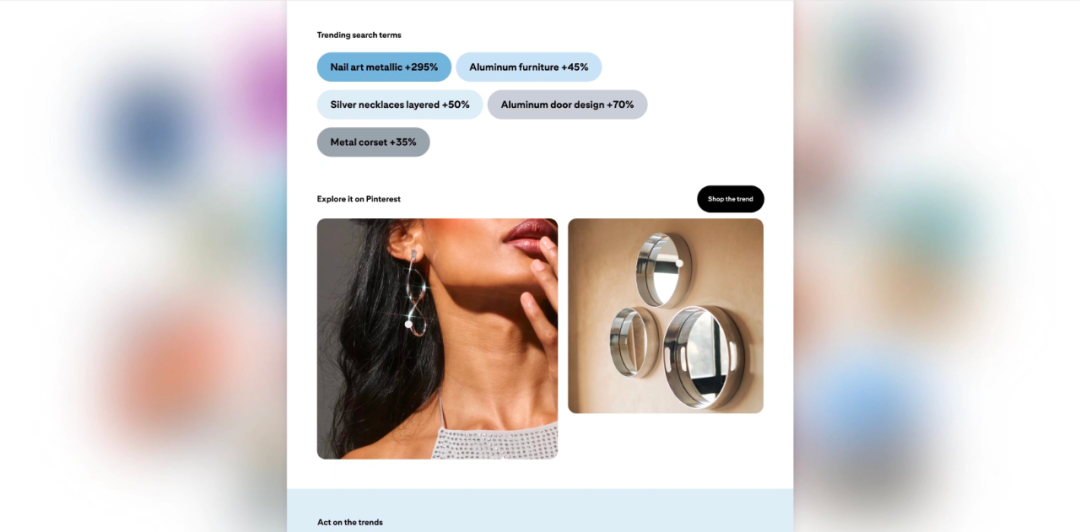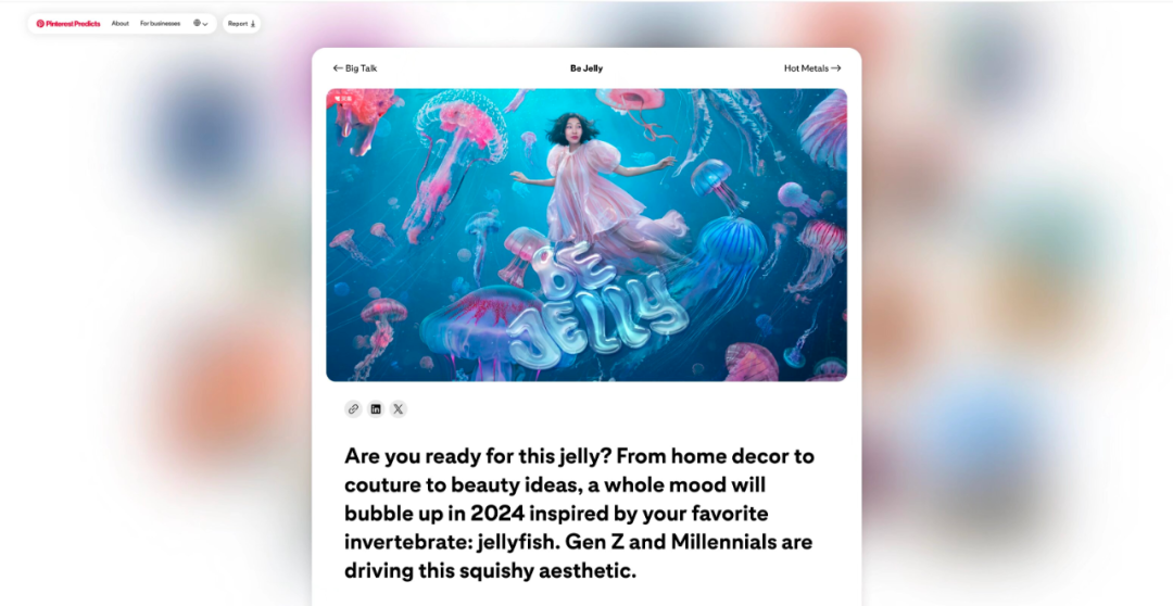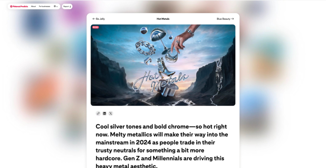 四、Pinterest推出2024设计流行趋势预测报告Pinterest 推出了2024的设计流行趋势预测报告,总结了23个关键词,包括Be jelly、Hot metal等具有强烈Z世代年轻人喜好属性等关键词上榜。Pinterest 根据自家搜索数据的分析总结出这份榜单,其中覆盖了未来人们的购物、旅行、饮食等方方面面的消费趋势。