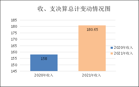 2021年度收、支总计180.65万元。与2020年相比,收、支总计各增加22.65万元,增长14.34%。主要变动原因是单位本年进行单位换届以及脱贫攻坚经费支出增加。