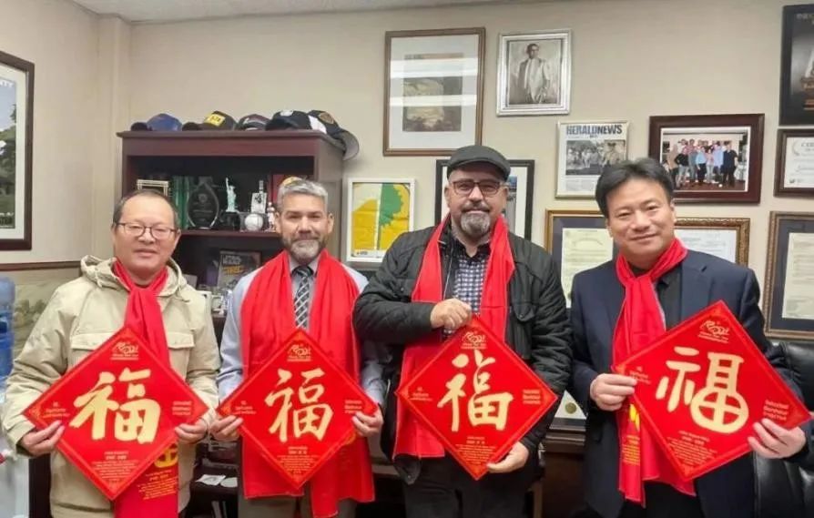 1月21日,玉兔迎春—庆祝2023农历新年中美、加艺术家送福拜年活动走进美国新泽西州帕特森市政厅送福拜年。