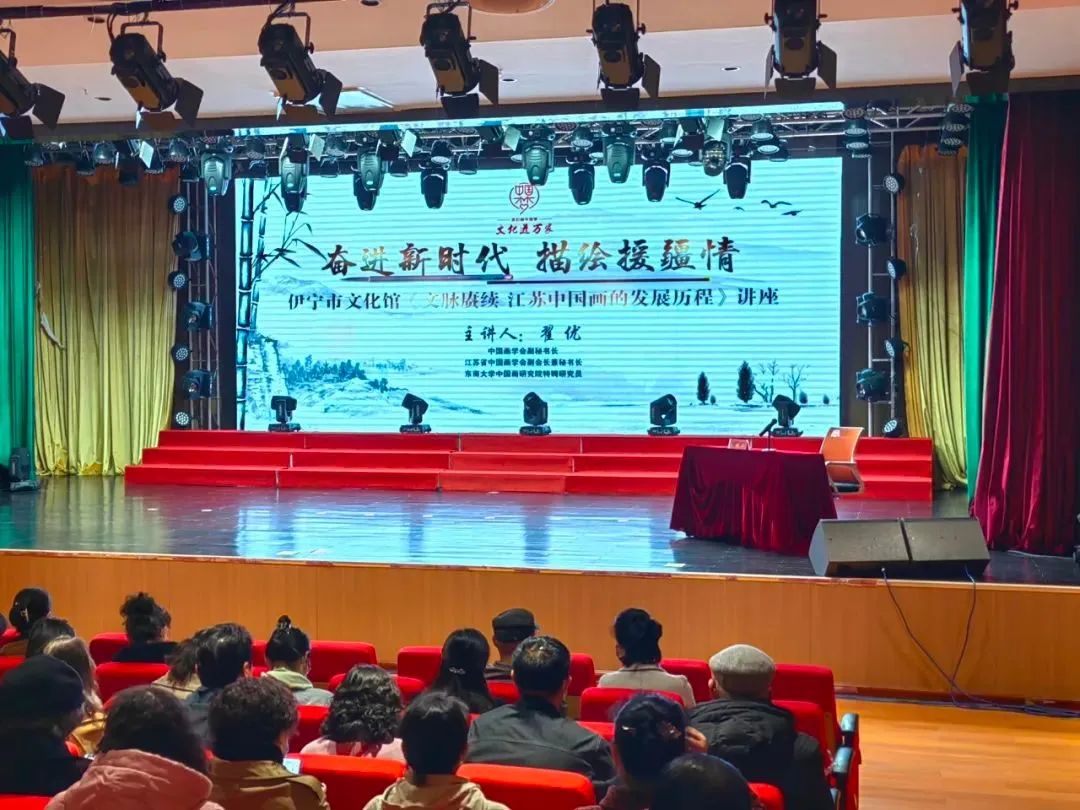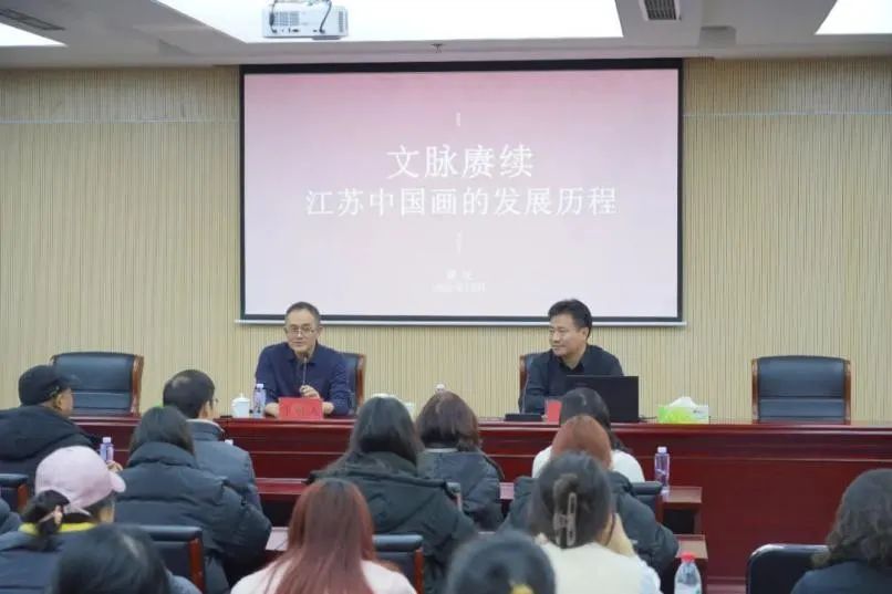 12月27日下午,中国画学会副秘书长、江苏省中国画学会副会长兼秘书长翟优结合正在淮安市美术馆展出的“文脉心迹——2023江苏省中国画学会作品展”在淮安市美术馆报告厅作了《文脉赓续——江苏中国画的发展历程》专题讲座。