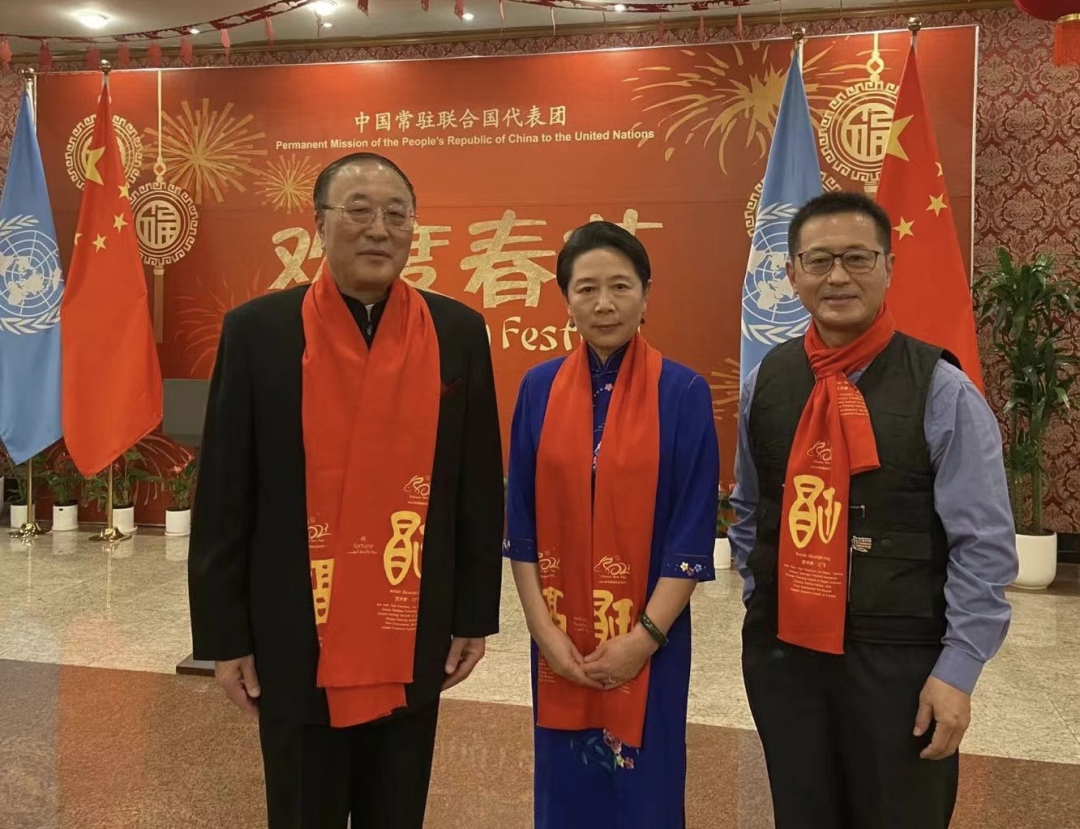 1月19日,“玉兔迎春-中美、加艺术家送福拜年活动”走进中国常驻联合国代表团,为中国常驻联合国代表张军大使和夫人田丽颖送福。