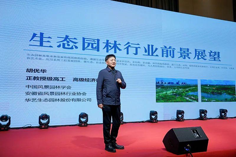 胡优华代表主办单位在致辞中对中国风景园林学会、安徽省住房和城乡建设厅长期以来对我省风景园林事业发展和行业协会建设的大力关心和支持表示感谢!对全体与会代表表示亲切的问候和祝福!他指出行业协会是我们全省行业会员企业的“娘家人”,都是美丽江淮家园的建设者。我们一定要在党和政府的坚强领导下,积极联合社会组织、企事业单位、全省高校等加强多方面的协同合作,一起交流行业发展新思想,谋划企业发展新动能,探讨高质量发展新路径,为美丽中国、美丽安徽建设积极贡献自己的力量。并期望与大家携手共进,共同创造一个更加美好的未来!
