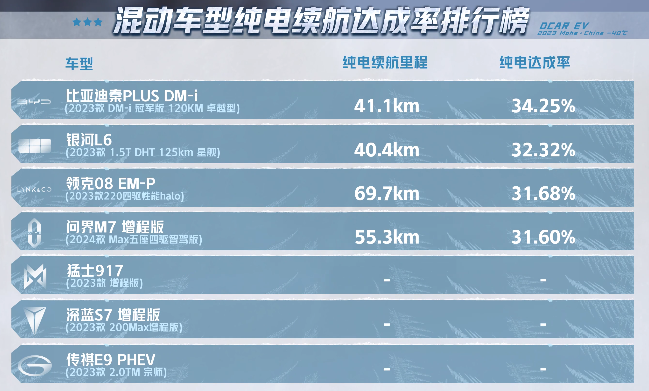 需要注意的是,随着增程式和插电混动车型已逐渐成为除纯电车型之外、新能源汽车赛道上的另一大主要品类产品,纯电续航达成率也成为考量产品的关键指标,因为纯电续航达成率越高,消费者使用增程式或插电混动车型的成本就会越低,反之亦然。