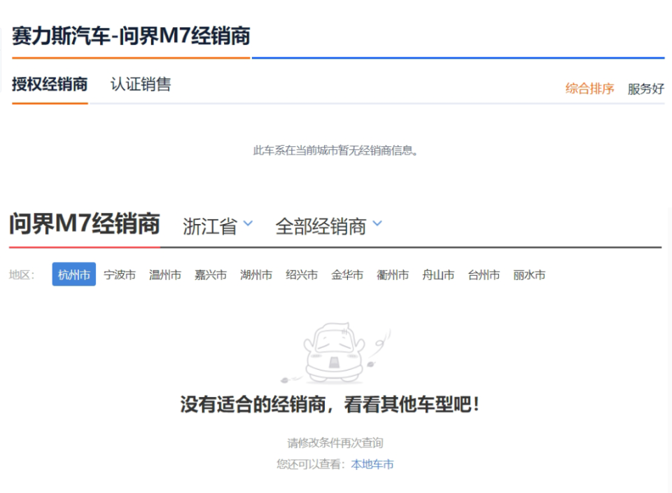 对此,连线出行也登录了汽车之家、易车和懂车帝三大官网,并且都以“问界M7”进行搜索,可以看到车型的照片和价格都还在,但查询当地经销商时,没有任何结果显示,可见销售合作确实已经停止。