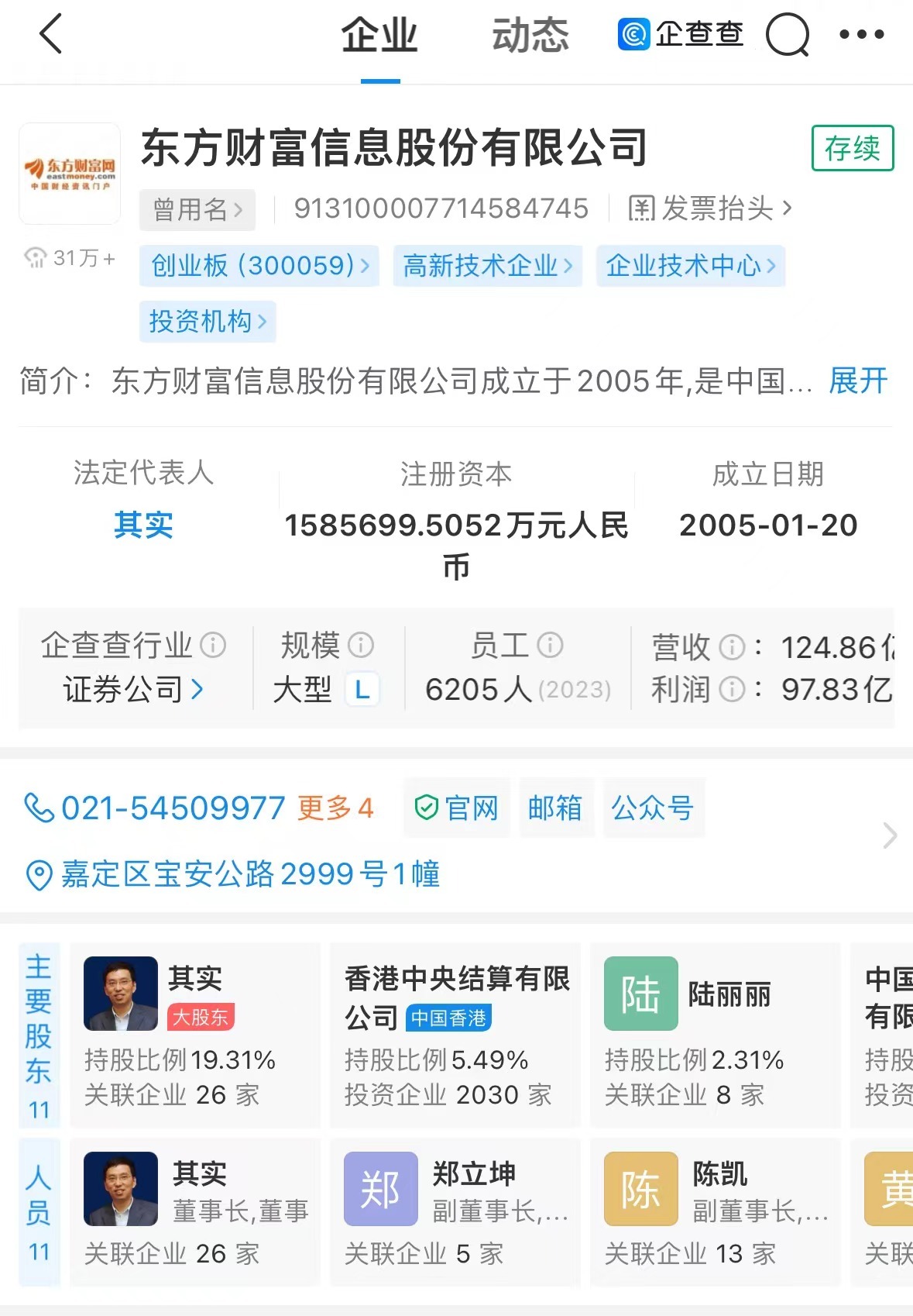 其实,1970年10月生,本科毕业于上海交通大学,复旦大学博士研究生学历、博士学位,第十四届全国人大代表。2005年创办东方财富,现任东方财富董事长。据企查查显示,其实在东方财富的的持股比例为19.31%,按东方财富目前的市值计算,其身家达到了401.7亿元。
