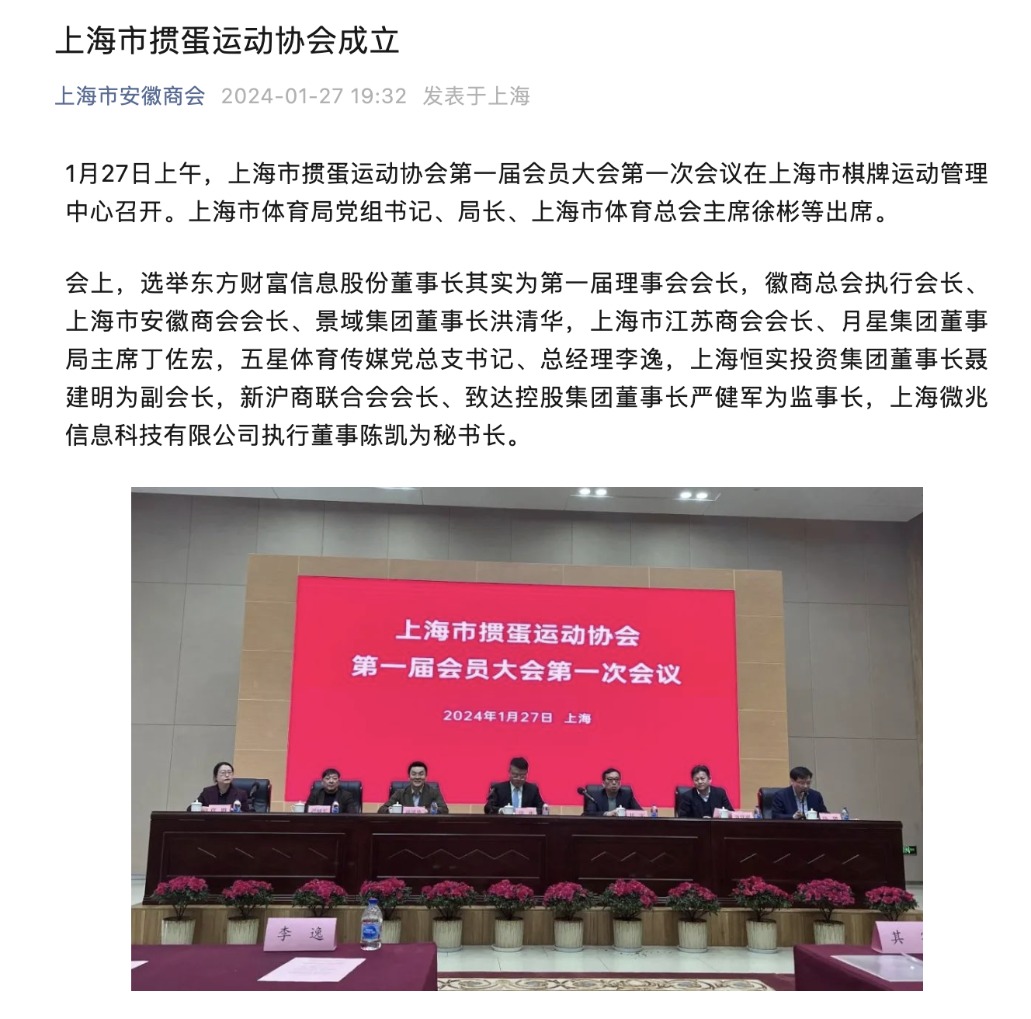 会上,选举东方财富(300059.SZ,股价13.12元,市值2080.44亿元)董事长其实为第一届理事会会长,徽商总会执行会长、上海市安徽商会会长、景域集团董事长洪清华,上海市江苏商会会长、月星集团董事局主席丁佐宏,五星体育传媒党总支书记、总经理李逸,上海恒实投资集团董事长聂建明为副会长,新沪商联合会会长、致达控股集团董事长严健军为监事长,上海微兆信息科技有限公司执行董事陈凯为秘书长。