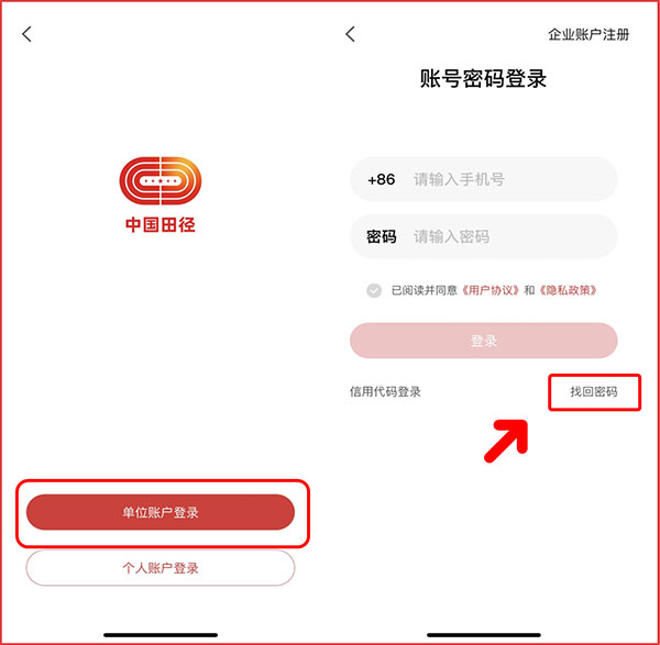 1、登录:打开中国田径APP,点击“我的”,点击“单位账户登录”。