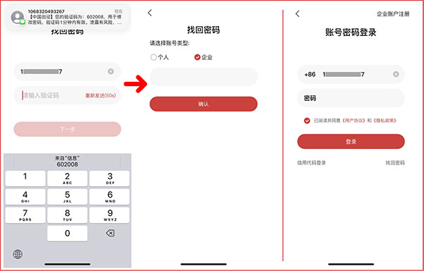 3、重设密码后登录:输入手机号及验证码后,勾选“企业”的账号类型,输入新密码(6-20位的数字与字母组合),点击“确认”后,显示“修改成功”;输入手机账号及新密码,勾选“已阅读并同意”重新登录。