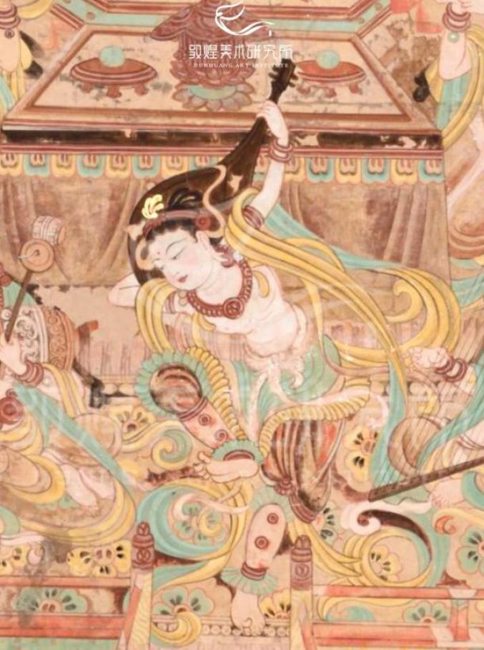 敦煌美术研究所专家临摹的莫高窟112窟(中唐)南壁观无量寿经变中的反弹琵琶飞天。图片来源:敦煌美术研究所小红书号