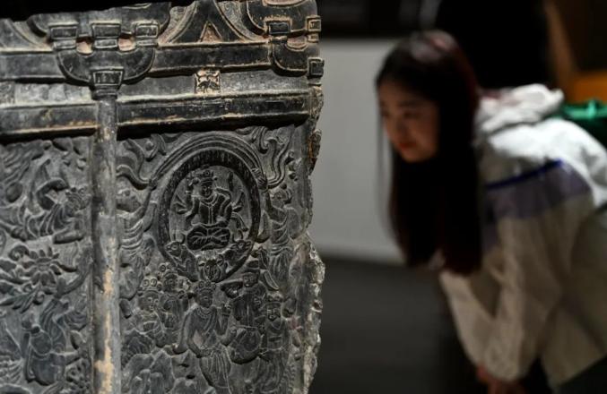 这是在西安博物院展出的史君墓石椁。墓主史君是北周凉州萨保,粟特人。石椁四壁浮雕内容和风格带有鲜明的西域特色。新华社记者 李一博 摄