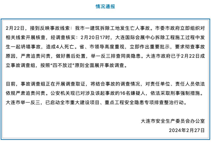 ●2月20日17时,大连国际会展中心拆除工程施工过程中发生一起坍塌事故,造成4人死亡。16人被采取刑事强制措施。