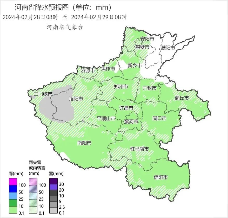 今天河南将有一场大范围弱降水上线,预计傍晚到夜里,黄河以南小雨转雨夹雪或小雪,高海拔山区有小到中雪,其他县市局部有雨夹雪或零星小雪。
