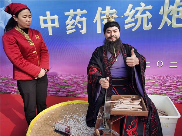 “曹操”现场切制中药饮片并推介亳药。汝平 摄