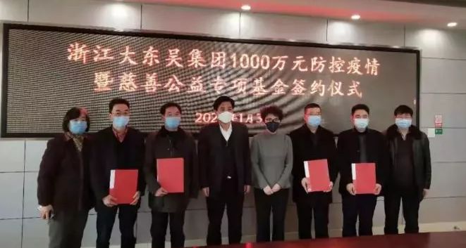 1月31日,浙江大东吴集团有限公司捐赠资金1000万元,与湖州市慈善总会、湖州市住房和城乡建设局、湖州市卫健委共建“浙江大东吴慈善公益专项基金”,专项用于建设领域疫情防控工作。