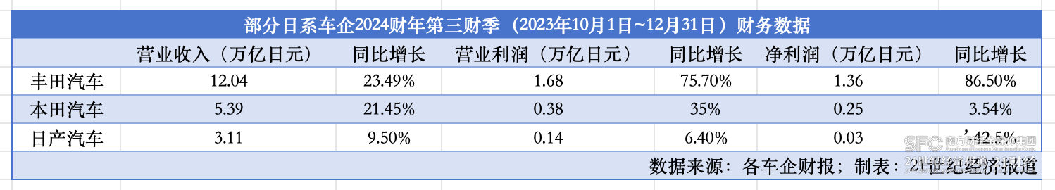 日前,日系车企三强丰田汽车、本田汽车、日产汽车公布了2024财年第三财季(2023年10月1日-2023年12月31日)的业绩报告。