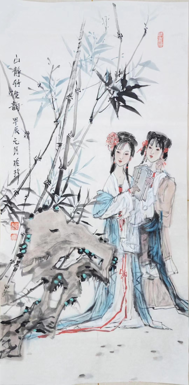 “我叫冷珍,是山东女书画家协会的副主席,今天非常荣幸能到文化世界来,这不是第一次,以前我和爱人一块儿来过,我的绘画主要是表现女性题材为主,既有古代女性,更多是现代女性,包括少数民族女性、女军人、健康知识分子女孩等等。我今天画的两位‘女神’是古代女性,通常定义为仕女,配景为青竹和赏石。