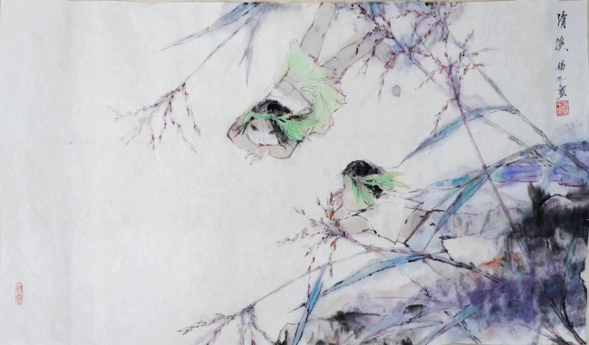 张锦平为自己的画命名《清溪》,画的是两个孩子趴在清澈的溪水边忘情地玩耍,头上戴着青翠鲜嫩的草环,岸边是张锦平家乡特有的,长在水边的一种野草,她给它们起了个名字叫“樨草”,这一幕应该就是她童年在家乡的记忆吧。