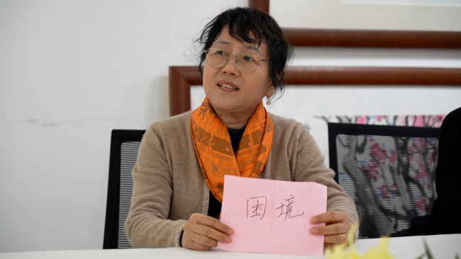 抽到“困境”的是国家一级美术师、山东省女书画家协会副主席刘爰:“这个话题我觉得非常好,拿到的时候我就在思考,以我们的年龄到这种画画水平,也是经过了几十年,但我们也面临着逐渐老去。从创作上来说,我确实有困境,作画的时候会感到无从下手,创作是非常难的,它源于生活,而我现在很深的困惑,就是觉得自己创作的作品太少了。”