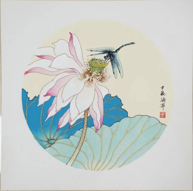 而任海宁主席为我们带来的作品也别具一格,是现场创作中唯一的一幅工笔画,也是她最拿手的。画中一朵盛开的荷花,粉色的花瓣迎风绽放,碧玉雕琢的莲蓬里结满金豆子般的莲子,个个饱满得已经要胀出来,一只墨蓝色的蜻蜓呼扇着翅膀轻轻立于其上。任海宁说荷花用来比喻女人最贴切:“出淤泥而不染,濯清涟而不妖。中通外直,不蔓不枝。”这就是她心中女性的形象,女性的品格。