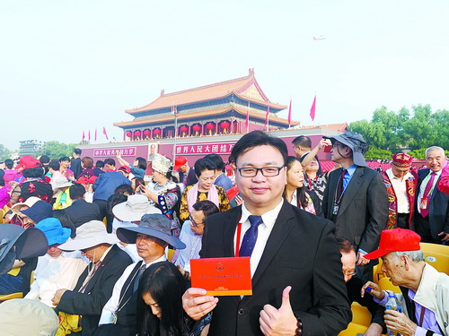 这是我第一次代表台湾青年参加国庆阅兵,心里感觉既兴奋又感动。