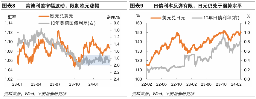 美元:美元指数可能继续保持102~105区间窄幅波动。未来一段时间,美国、欧洲和日本央行可能均处于“按兵不动”状态,令美元汇率保持相对平稳。欧元方面,欧央行最新发言暗示,可能在4月或6月的会议上进行首次降息,且6月降息的可能性大于4月。近期,10年期美德国债利差保持在1.7~2个百分点左右,维持在近一年最高水平,或限制欧元涨幅。日元方面,在日本银行退出负利率和YCC后,预计在较长时间里不急于退出零利率。未来一段时间,预计日债利率反弹有限,日元汇率可能保持弱势、或缓慢升值。