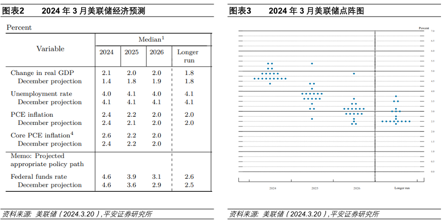 2) 通胀:维持2024年PCE通胀率预测为2.4%,上修核心PCE通胀率0.2个百分点至2.6%;基本维持2025年PCE及核心PCE通胀率预测为2.2%左右,2026年维持为2%。维持长期通胀水平为2%。