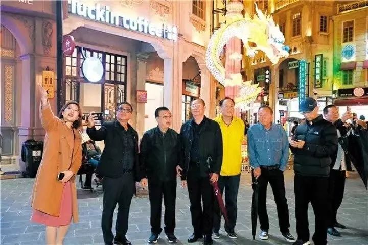 来到汕头百载商埠发源地小公园历史文化街区,中山纪念亭变身巨型“走马宫灯”,8面屏幕滚动展示汕头商埠文化和产业历史的“百业”特色,呈现当前汕头“以贸促工、以工兴贸、工商并举”的发展成果。从空中俯瞰,中山纪念亭如同一颗龙珠发出璀璨光芒,与周边街口布设的5座五彩盘龙柱交相呼应,传达出辰龙献瑞、五福临门的美好祝愿。