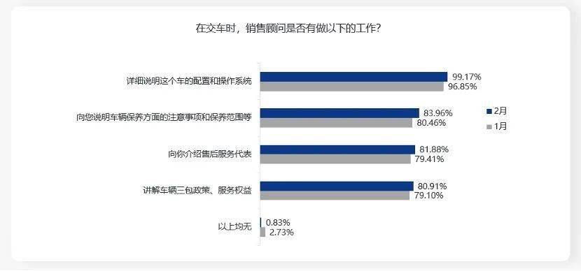 分析“在交车时,销售顾问是否有做以下的工作?”发现,各细项指标均有提升,其中“以上均无”的比例降至0.83%,是提升的主要原因。但是在介绍售后服务代表和讲解车辆三包政策服务权益方面仍有加强空间。