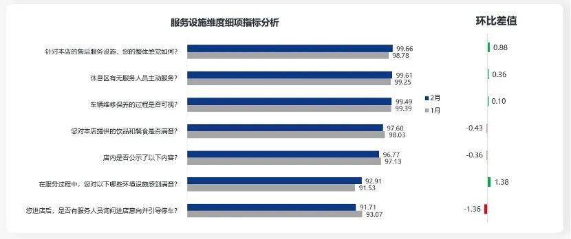分析服务设施维度各细项指标发现,“您进店后,是否有服务人员询问进店意向并引导停车?” 表现最弱,得分为91.71分,并环比下降1.36分。
