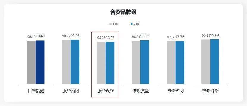 合资品牌组:合资品牌组售后服务口碑指数为98.49分,环比提升0.37分;在售后服务五维度中,仅服务设施维度下降0.2分。