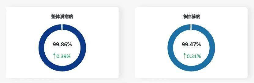 在关键指标方面,整体满意度环比提升0.39%,达到99.86%;净推荐度环比提升0.31%,达到99.47%。