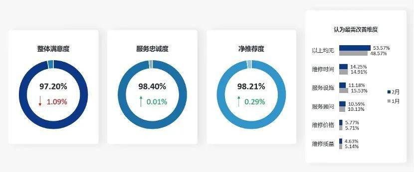 本月关键指标方面,售后服务整体满意度为97.20%,环比下降1.09%;服务忠诚度为98.40%,环比提升0.01%;净推荐度为98.21%环比提升0.29%;消费者主观认为最需要改善的维度是“维修时间”,占比14.25%。