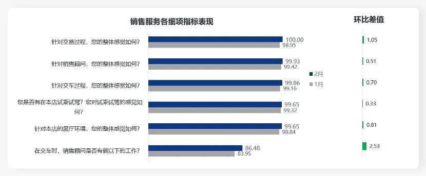 分析销售服务各细项指标发现,环比1月份均是提升状态,其中提升幅度最大的指标是“在交车时,销售顾问是否有做以下的工作?”,得分为86.48分,环比提升2.53分,不过仍然是本月表现最弱的指标。