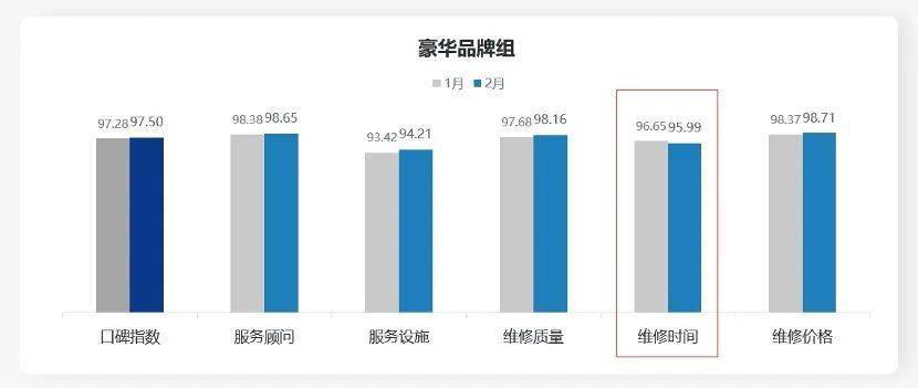 豪华品牌组:豪华品牌组售后服务口碑指数为97.50分,环比提升0.22分;在售后服务五维度中,仅维修时间维度下降0.66分。