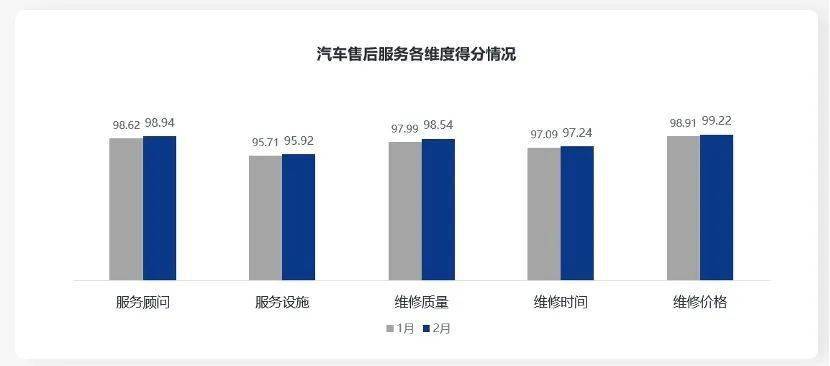 在汽车售后服务五维度中,各维度环比均有提升,其中维修质量维度环比提升0.55分,服务设施维度得分最低,为95.92分。