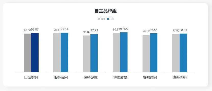 自主品牌组:自主品牌组售后服务口碑指数为98.87分,环比提升0.87分;售后服务五维度均环比提升,其中服务设施维度提升1.91分。