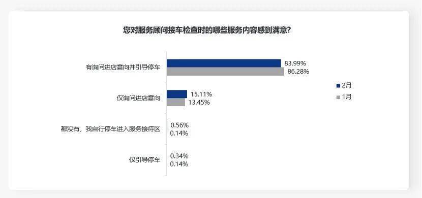 分析“您进店后,是否有服务人员询问进店意向并引导停车?”指标发现,做到“有询问进店意向并引导停车”的比例,环比降低2.29%。