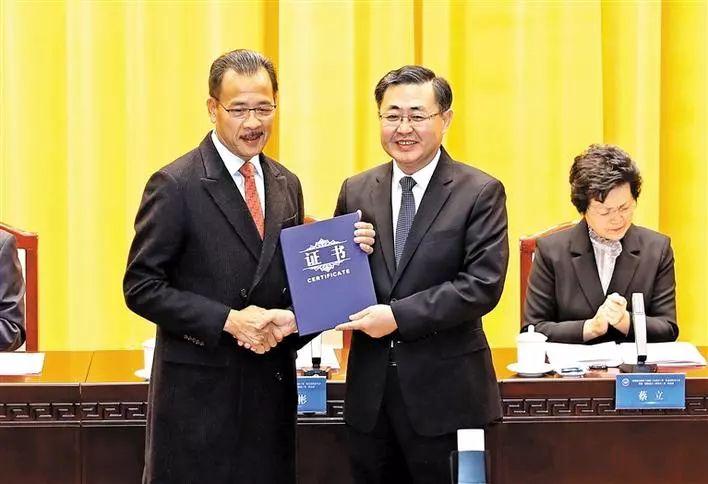 区委书记王宏彬(右)为新当选的区工商联(总商会)主席(会长)李沛良颁发任职证书。