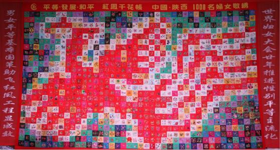 1995年,联合国第四次世界妇女大会在北京隆重召开,陕西省妇联号召全省108个县的10000多名基层妇女准备的特殊礼物“红凤千花帐”引人注目,它是省妇联从上万份绣品中臻选出1008幅作品拼制成的巨幅绣帐,画面是一只展翅飞翔的红凤。这幅绣品凝聚了全省各界妇女对这场国际盛会的祝福,也带给了世界各界妇女代表们无数的惊叹与赞许,最终成了这场盛会的一大遗产。