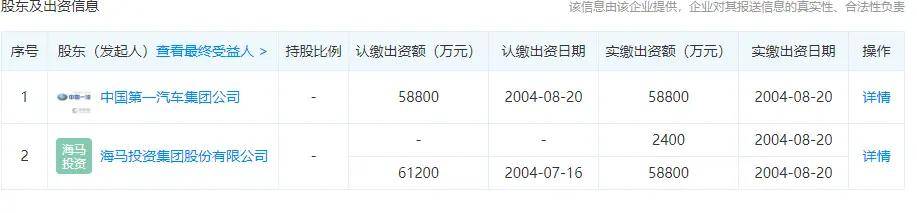 天眼查数据显示,海马汽车持有一汽海马51%股份,一汽占股49%。