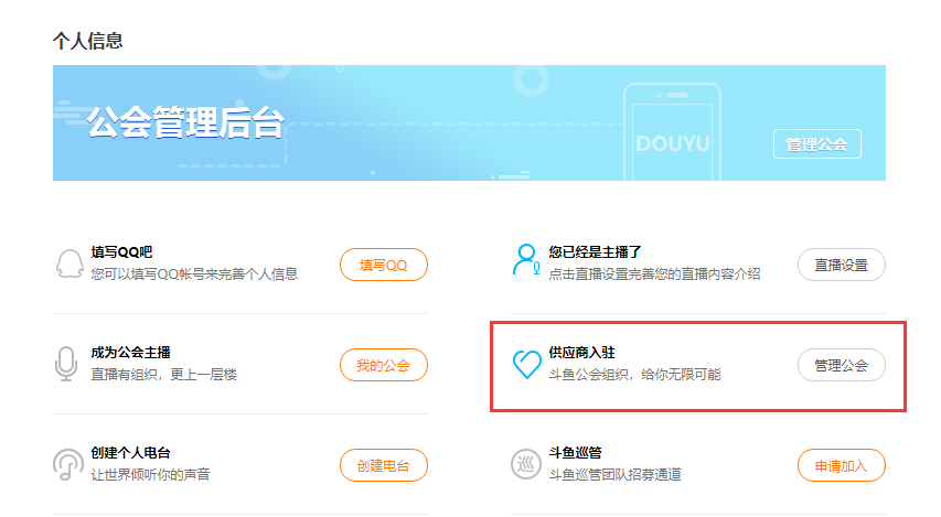 (登录斗鱼官网,进入个人中心——个人信息——供应商入驻——管理公会)