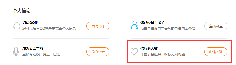 供应商入驻入口:(登录斗鱼官网,进入个人中心——个人信息——供应商入驻)
